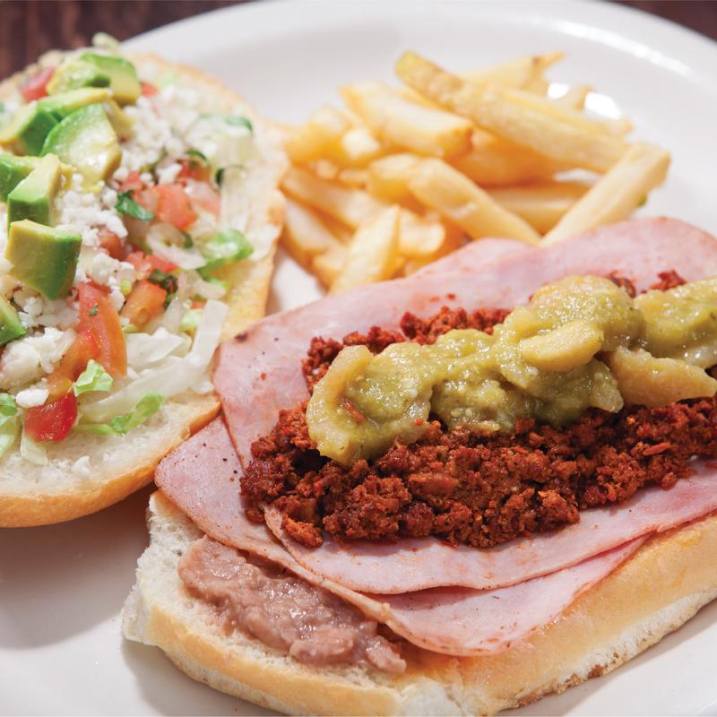 One ground beef or shredded chicken burrito topped with lettuce, tomatoes, sour cream and cheese. Served with rice or beans.