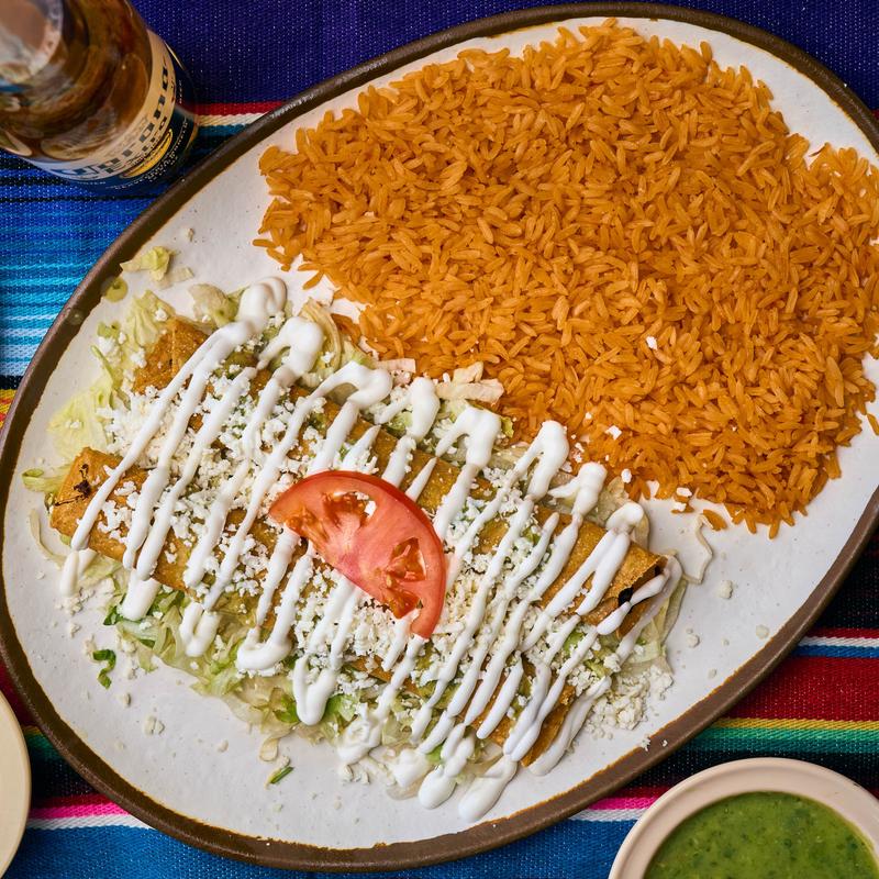Two chicken enchiladas served with rice and beans. Topped with your favorite sauce.