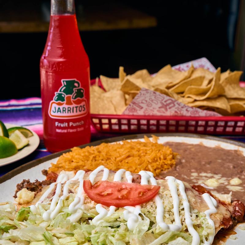 One beef burrito, one beef enchilada & rice.